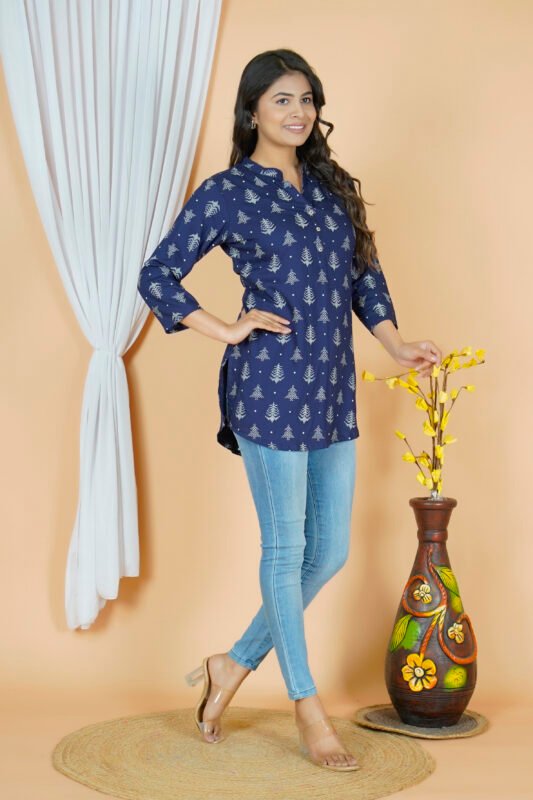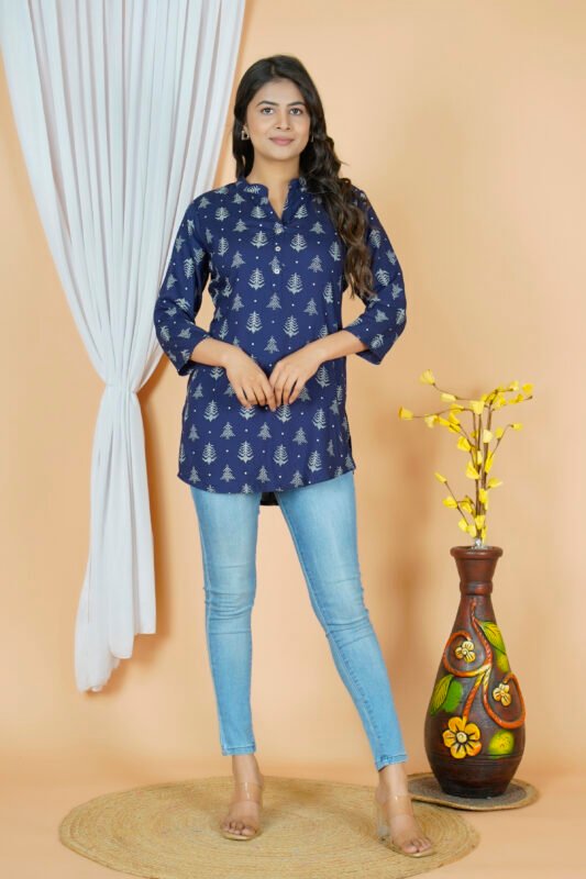 Blue Cotton Straight Short Kurti