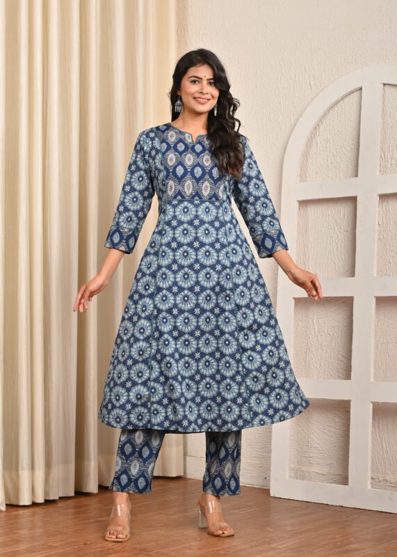 Cotton Printed Indigo Straight cut Kurta And Pant Set