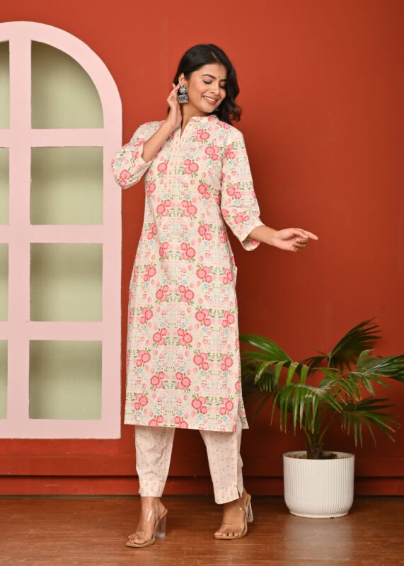 Cream And Pink Color Printed Straight Kurta Pant Set
