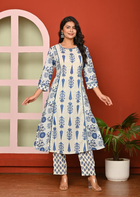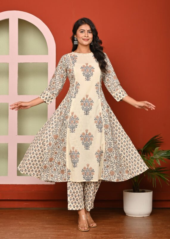 Women’s Cotton Printed A-line Kali Cut Kurta And Bottom