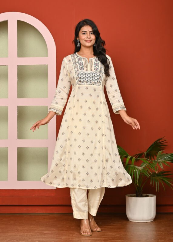 Cream Print & Embroidered Santoon A Line Kurta Pant and Dupatta Suit Set