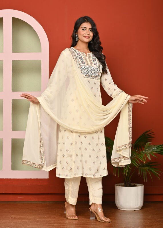 Printed Cream Color Flared Kurta Pant And Dupatta Suit Set