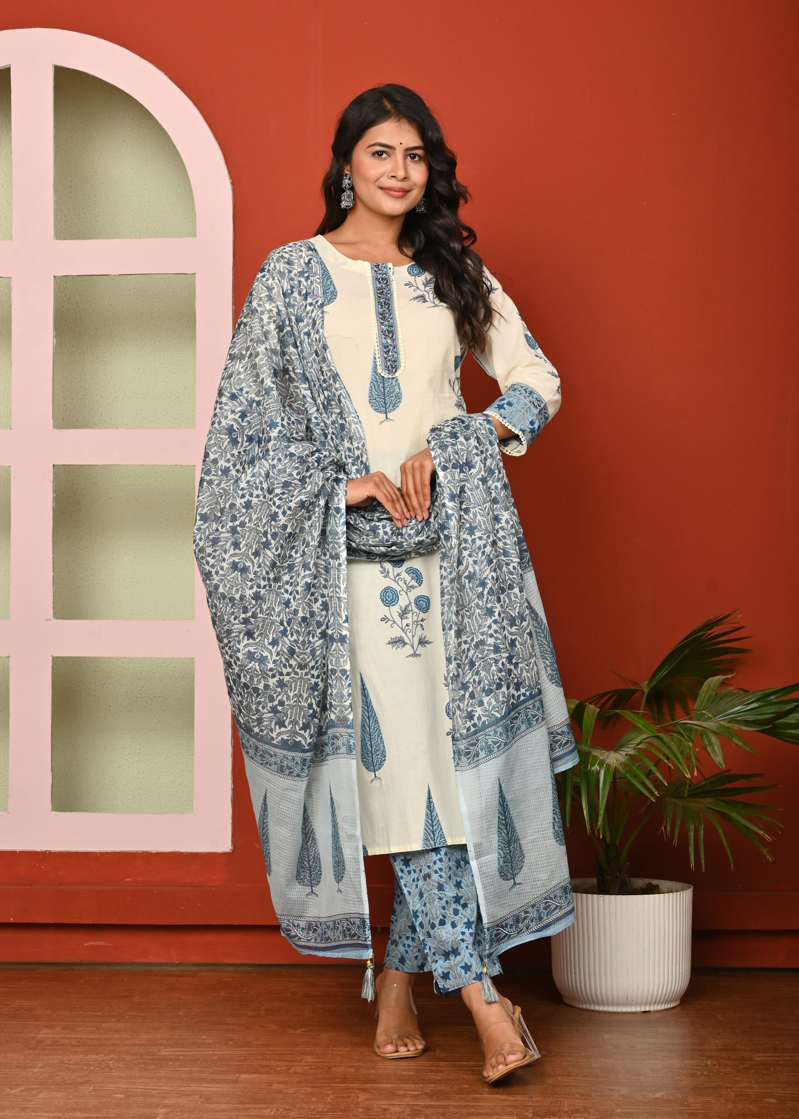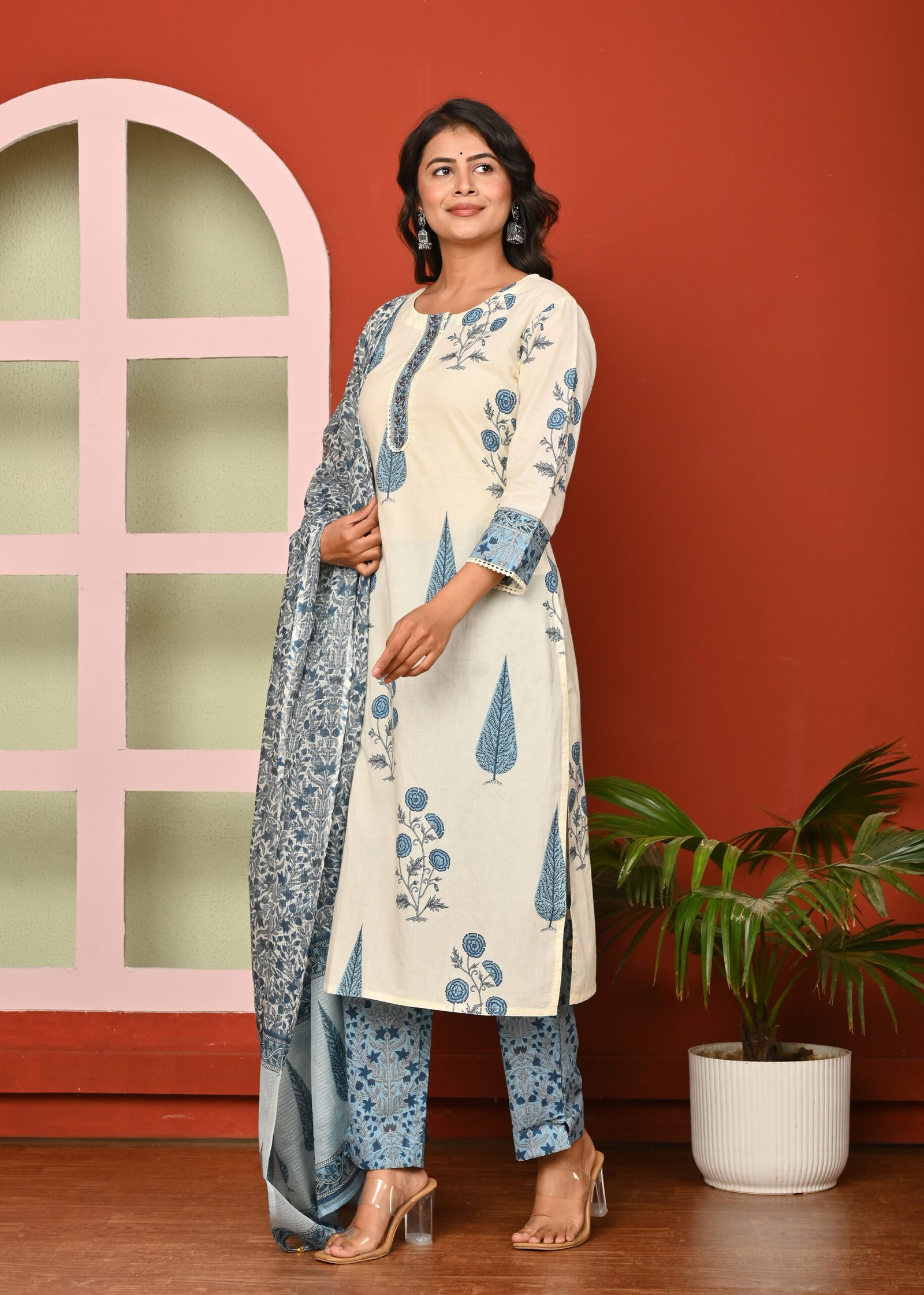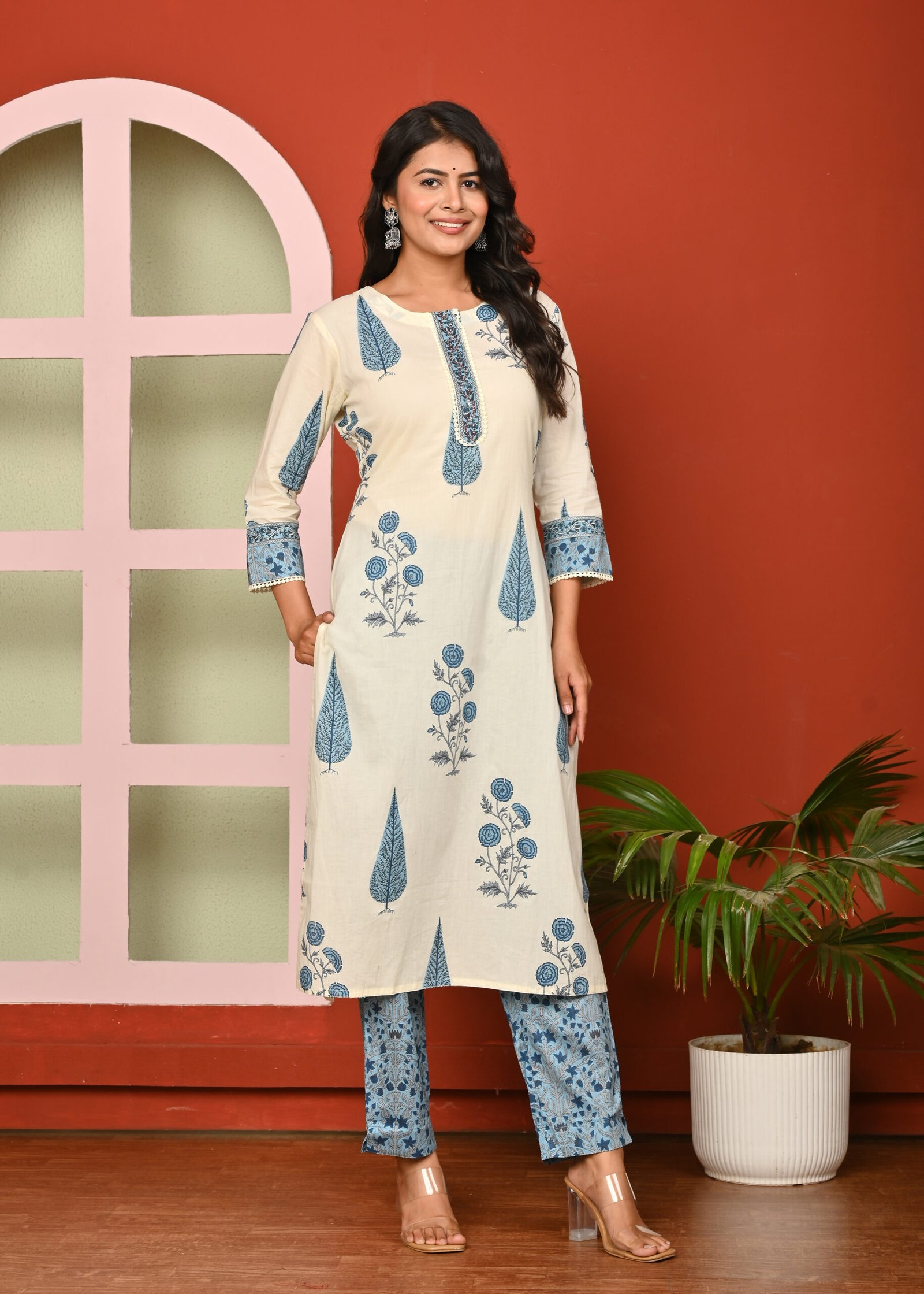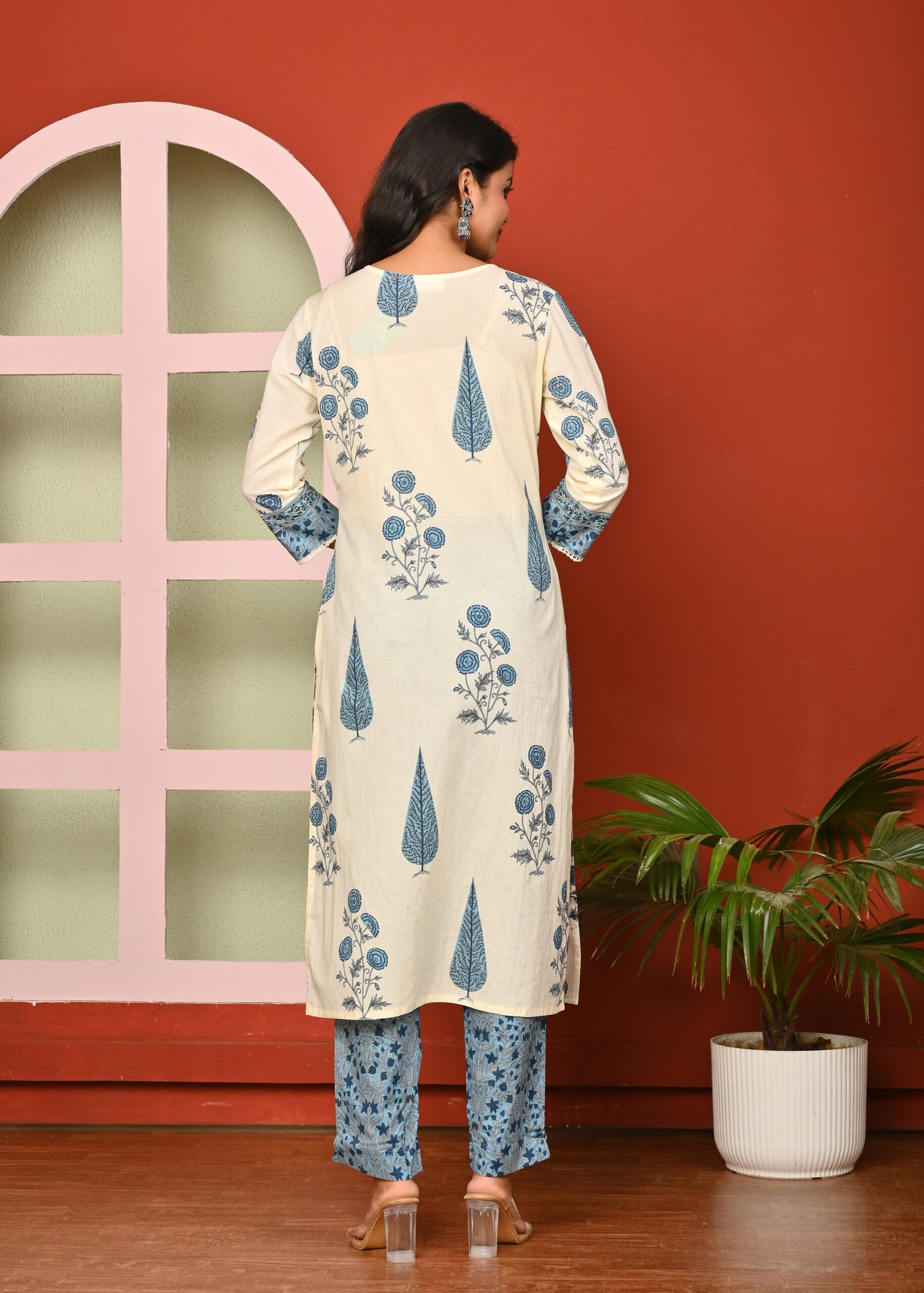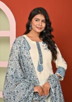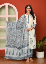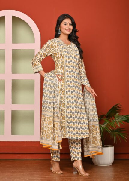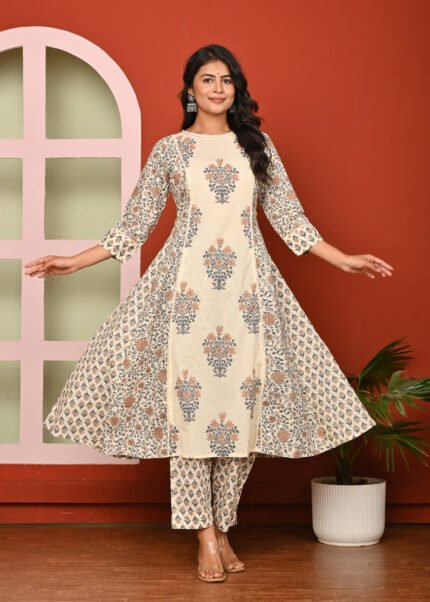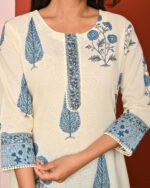 The cream color enhances the elegance of this attire, lending it a subtle and refined charm. Cream is a versatile shade that complements various designs and prints, allowing the intricate blue floral and leaf motifs to stand out beautifully. The kurta is adorned with traditional block-printed designs in blue, adding an ethnic yet contemporary appeal. The neckline and sleeve borders are highlighted with patterned detailing, giving it a finished and graceful look.