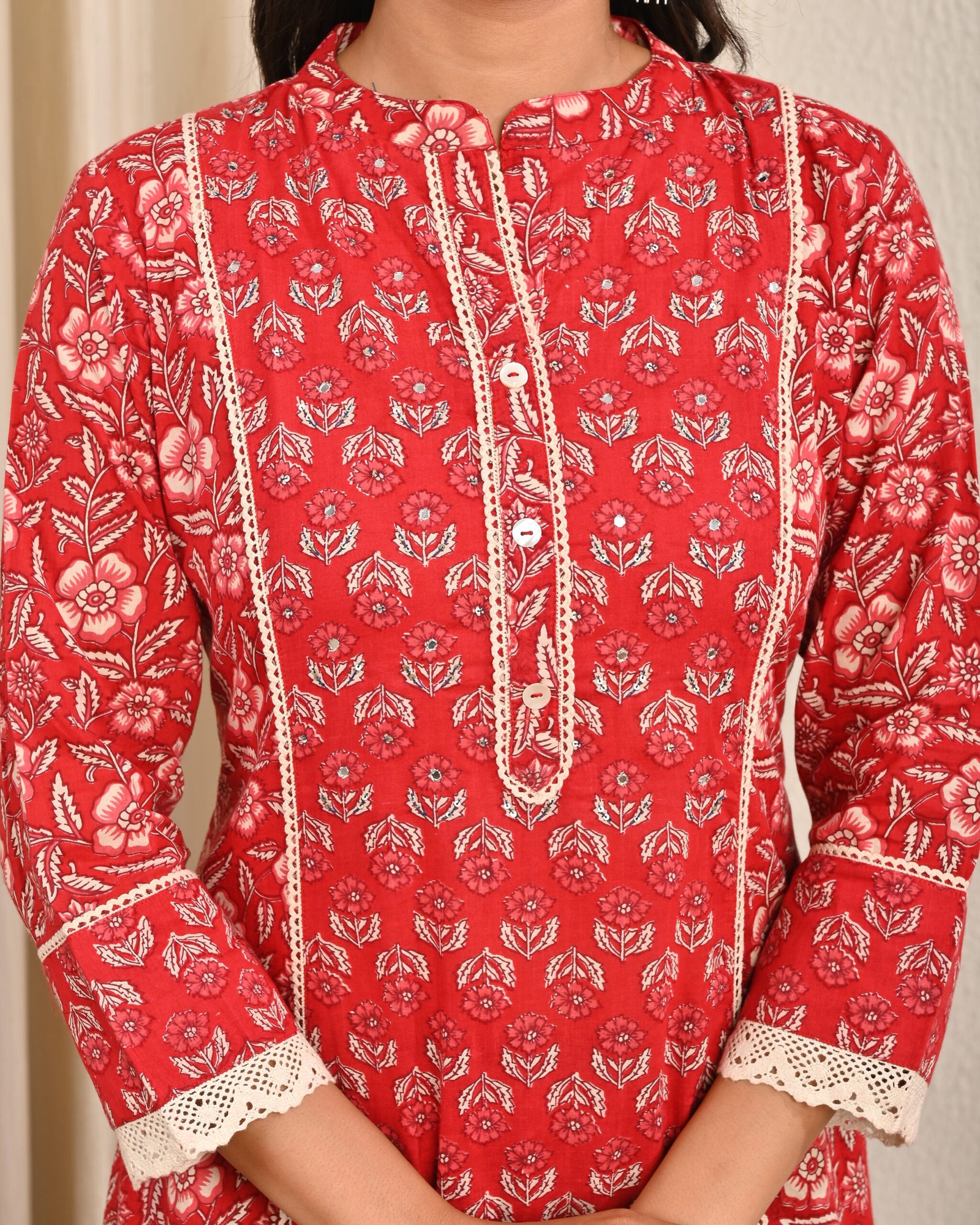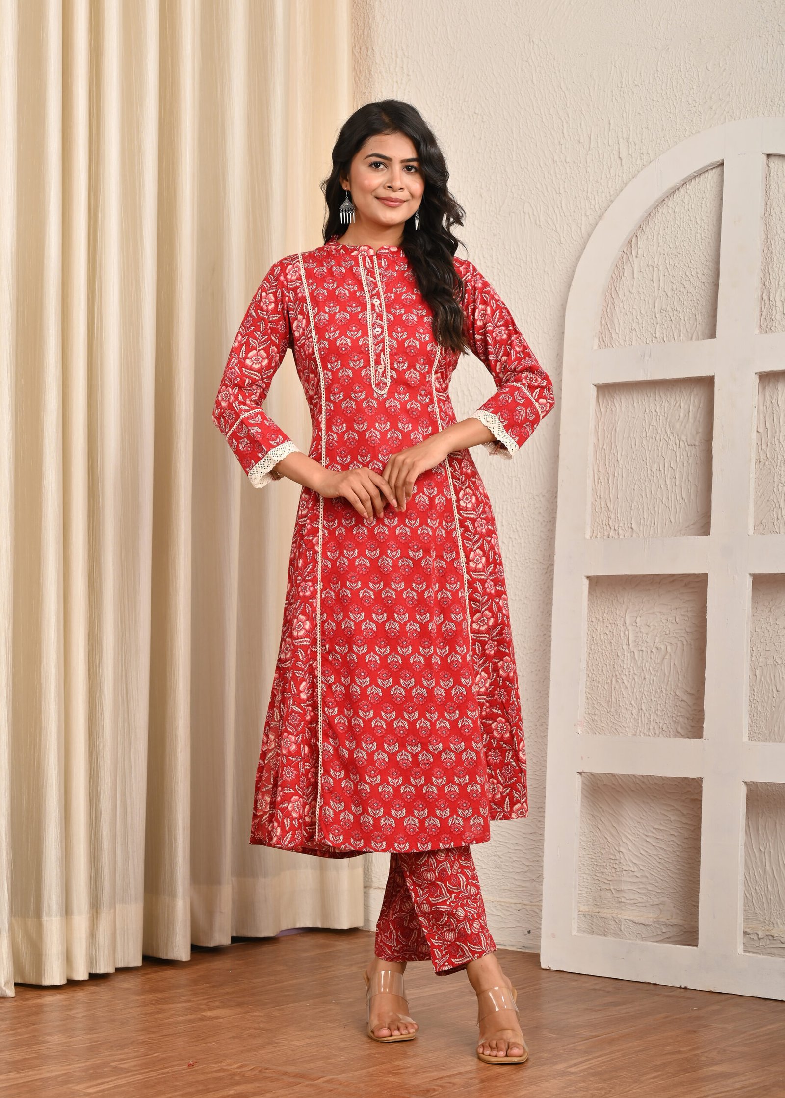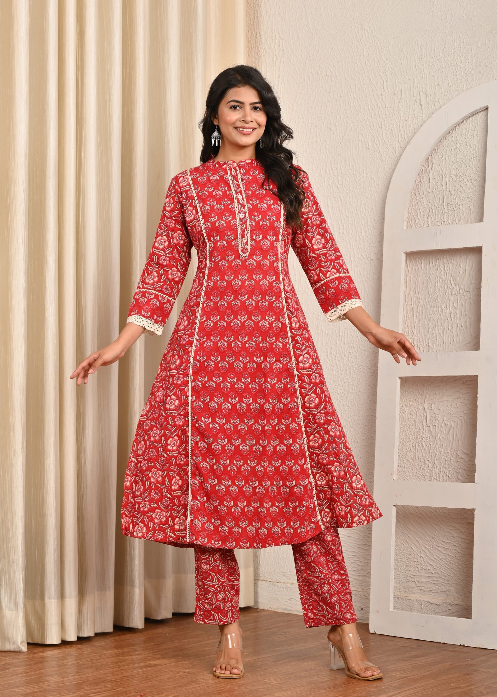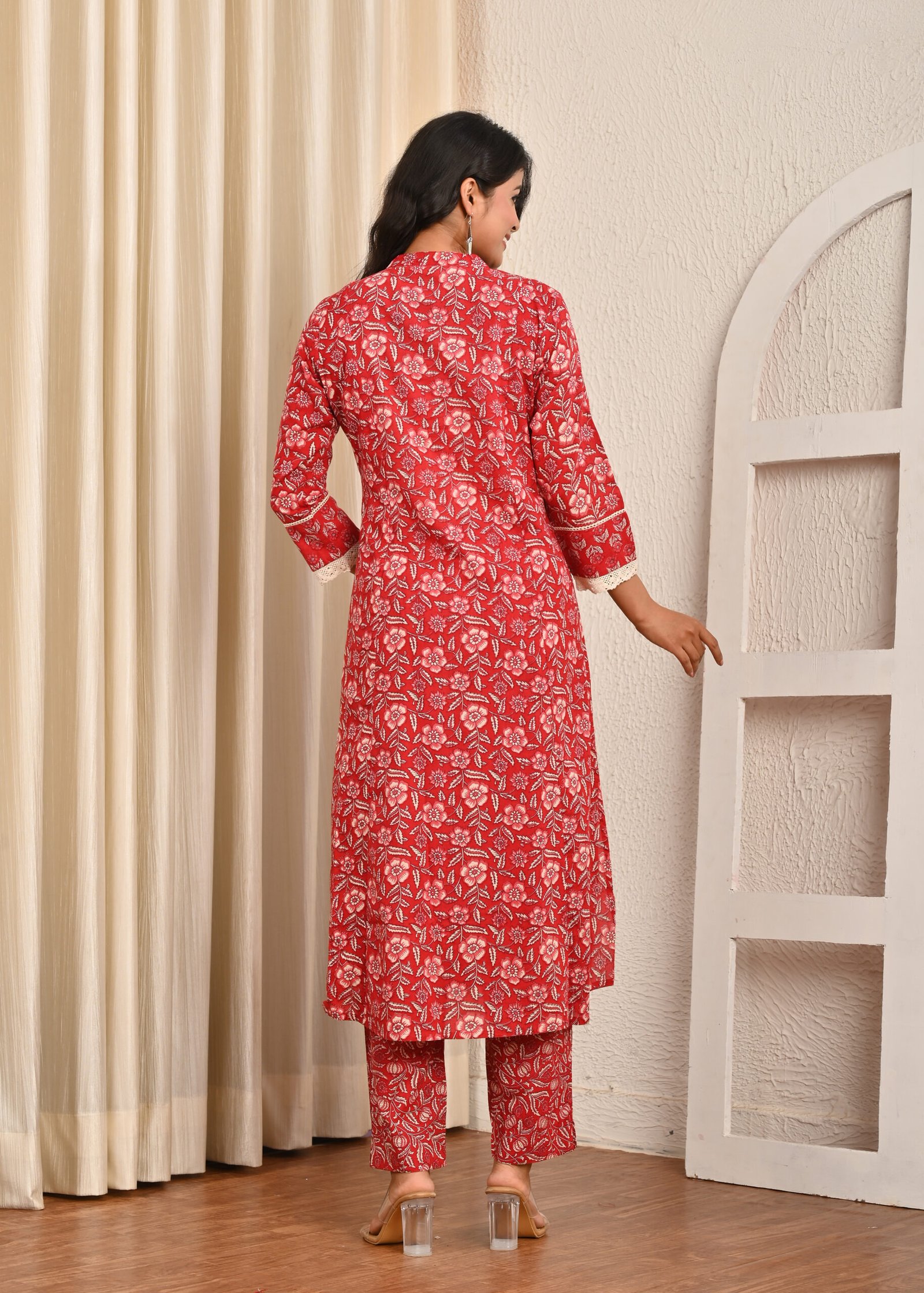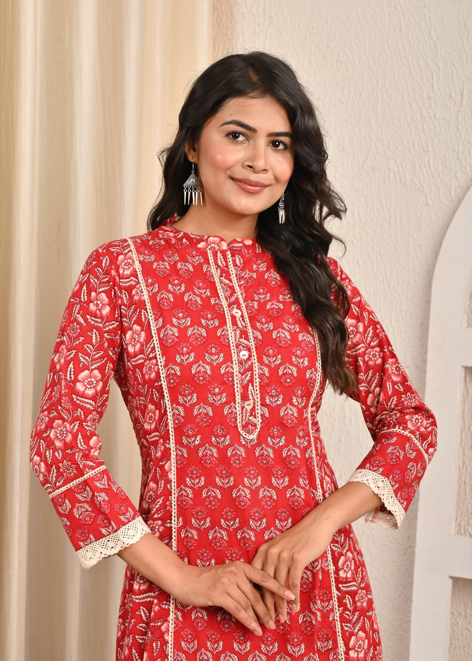 The base of this kurta is a bright Mahroon shade, beautifully decorated with delicate white block-printed floral motifs. The intricate print gives it a traditional appeal while maintaining a contemporary look suitable for modern styling. The kurta is designed in an A-line silhouette with carefully placed vertical panels, which enhance the overall fit and provide a flattering shape to the wearer. These panels also add movement to the fabric, making the outfit flow gracefully as one walks.