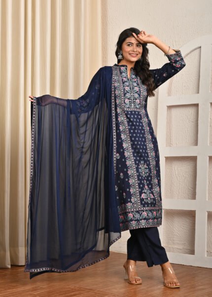 Blue Printed Santon Straight Kurta Pant And Dupatta Suit Set ₹2,599.00 Original price was: ₹2,599.00.₹2,299.00Current price is: ₹2,299.00.