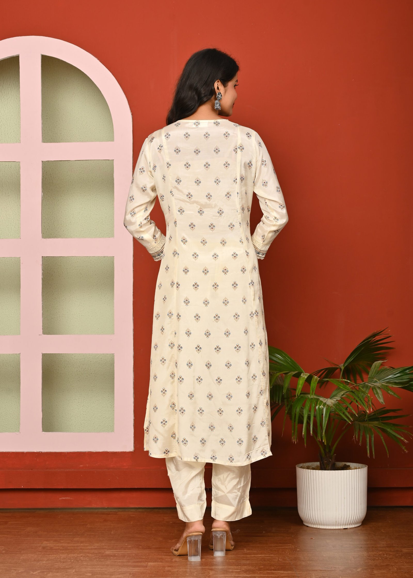 Printed Cream Color Flared Kurta Pant And Dupatta Suit Set