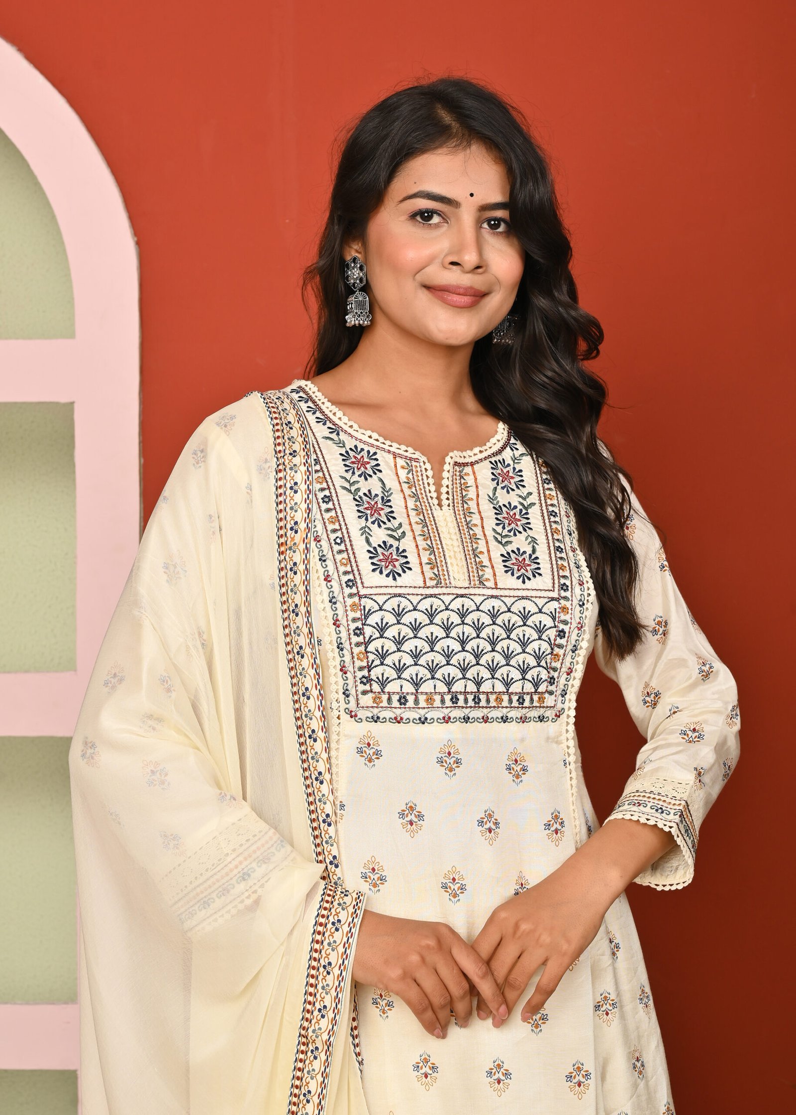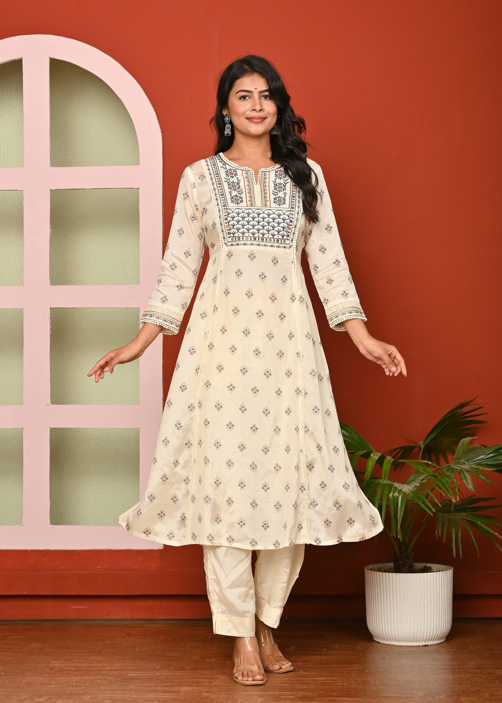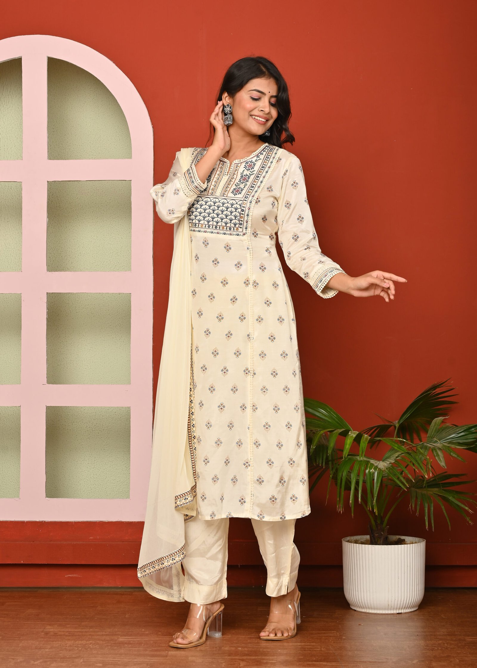 Home 3Pcs Set Cream Print & Embroidered Santoon A Line Kurta Pant and Dupatta Suit Set