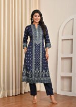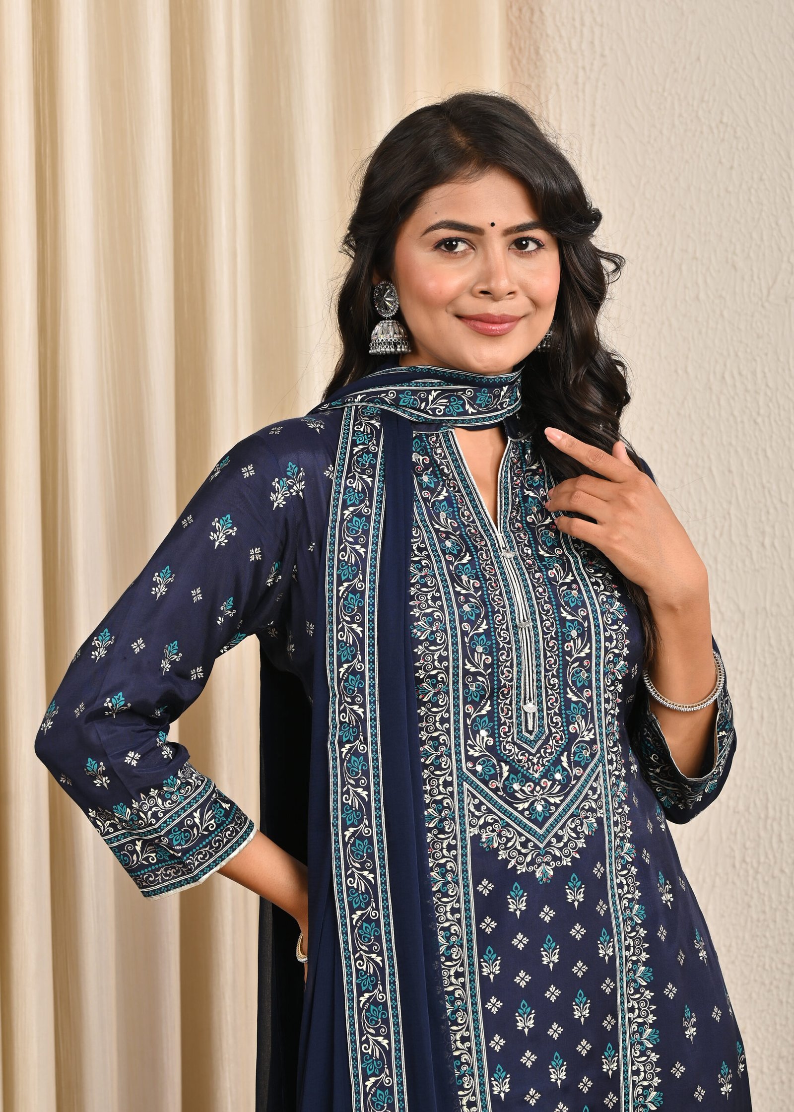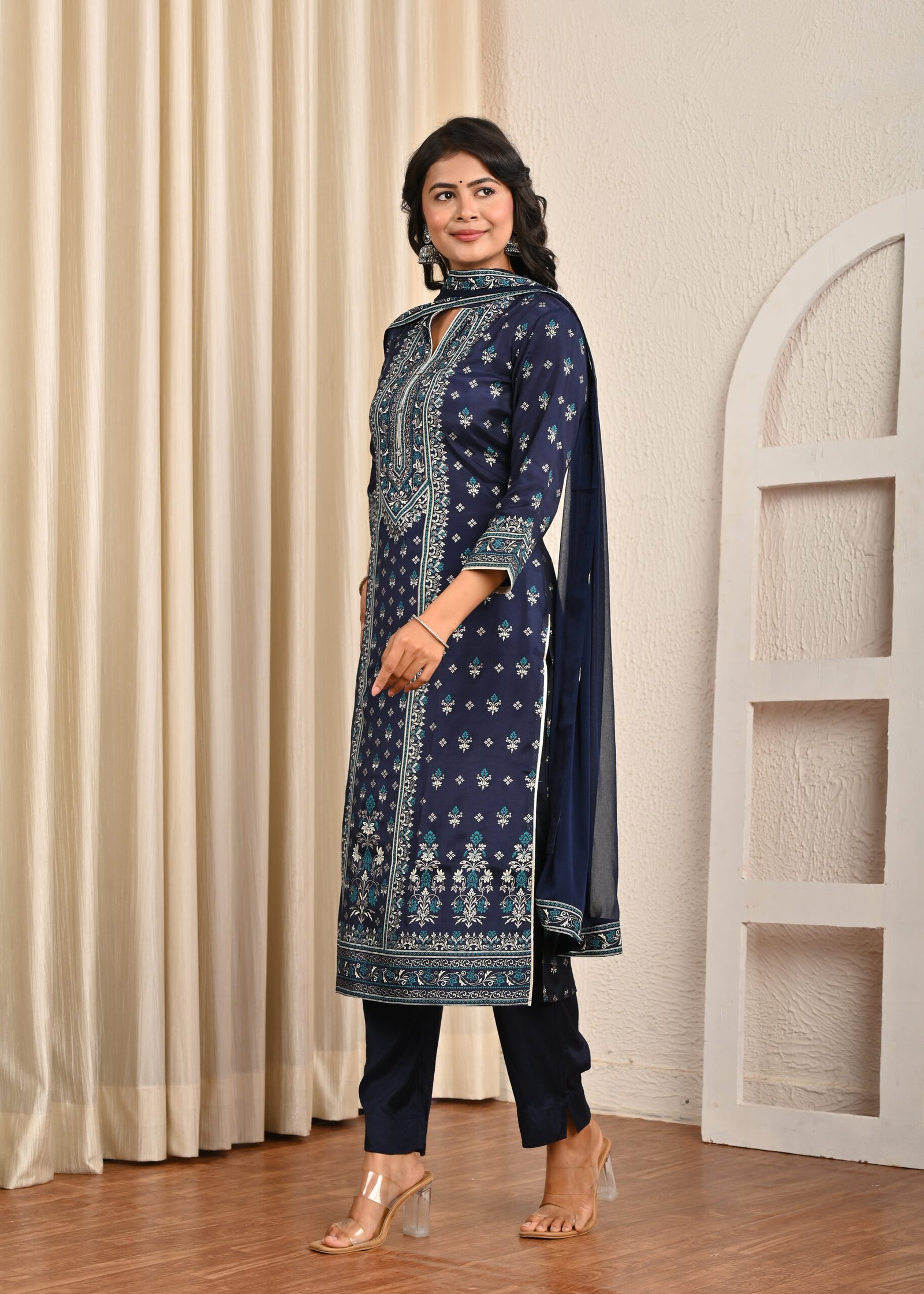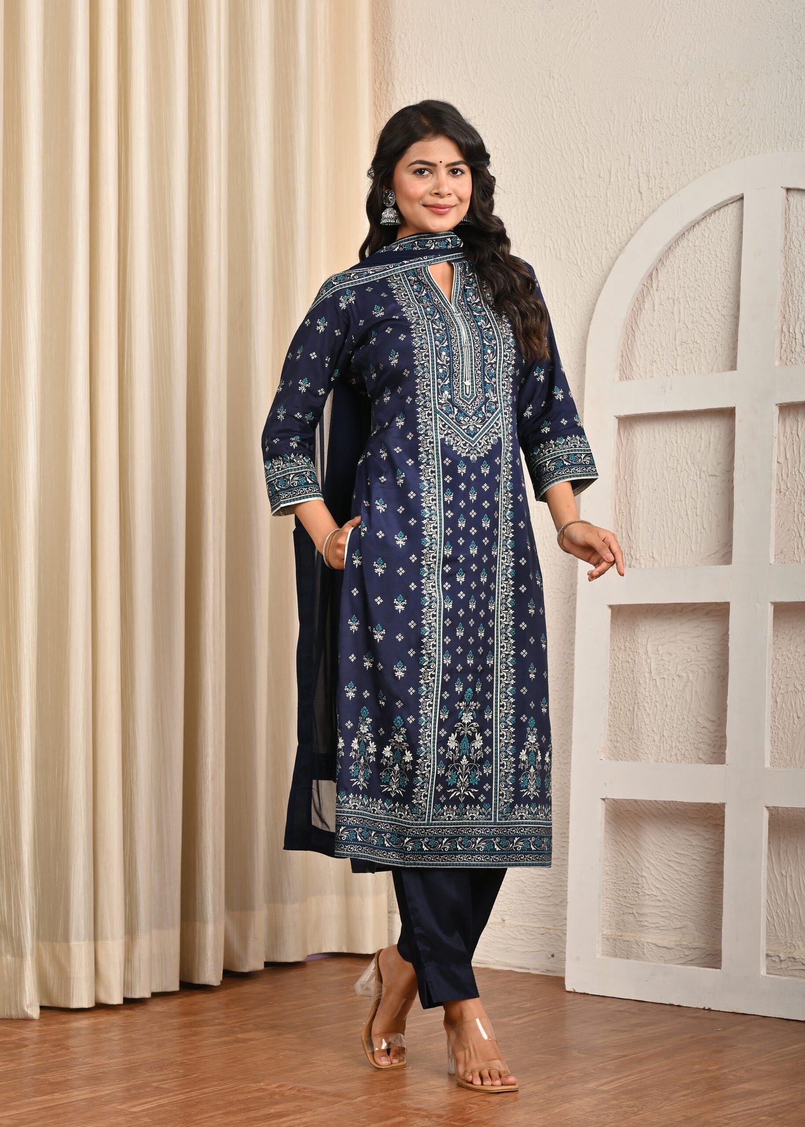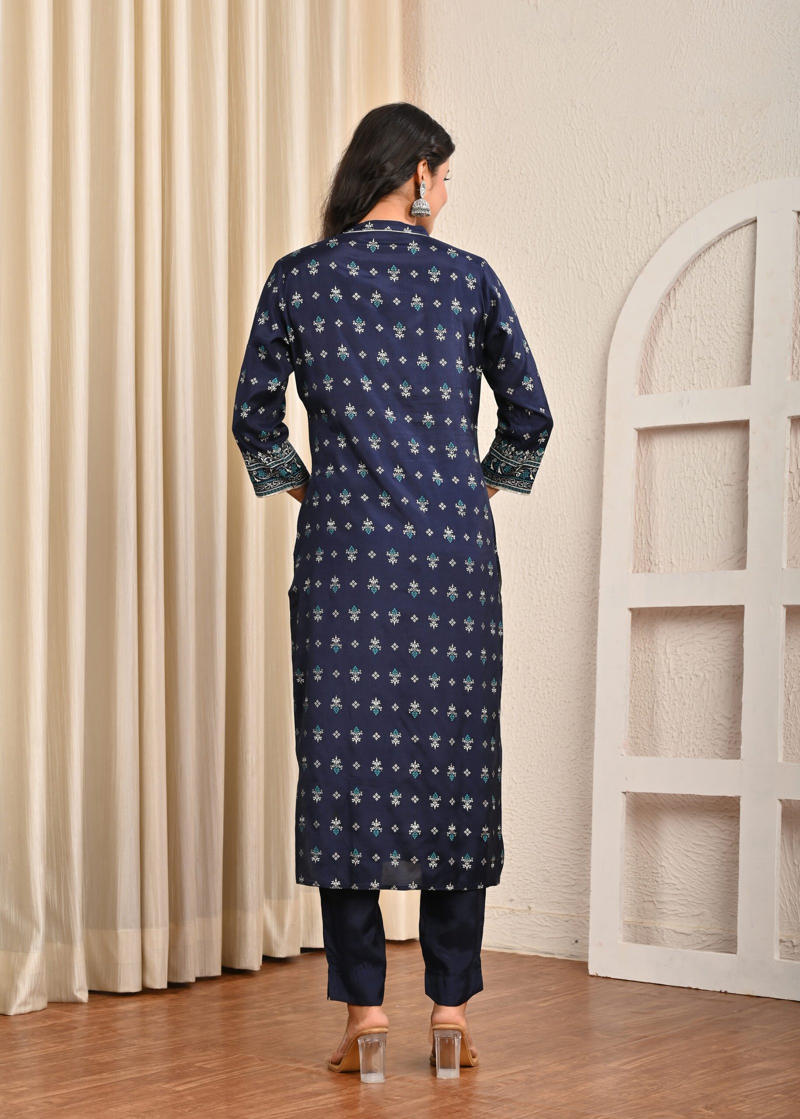 This navy blue santoon suit set is perfect for festive wear, family gatherings, office parties, or even casual ethnic styling with a touch of elegance.