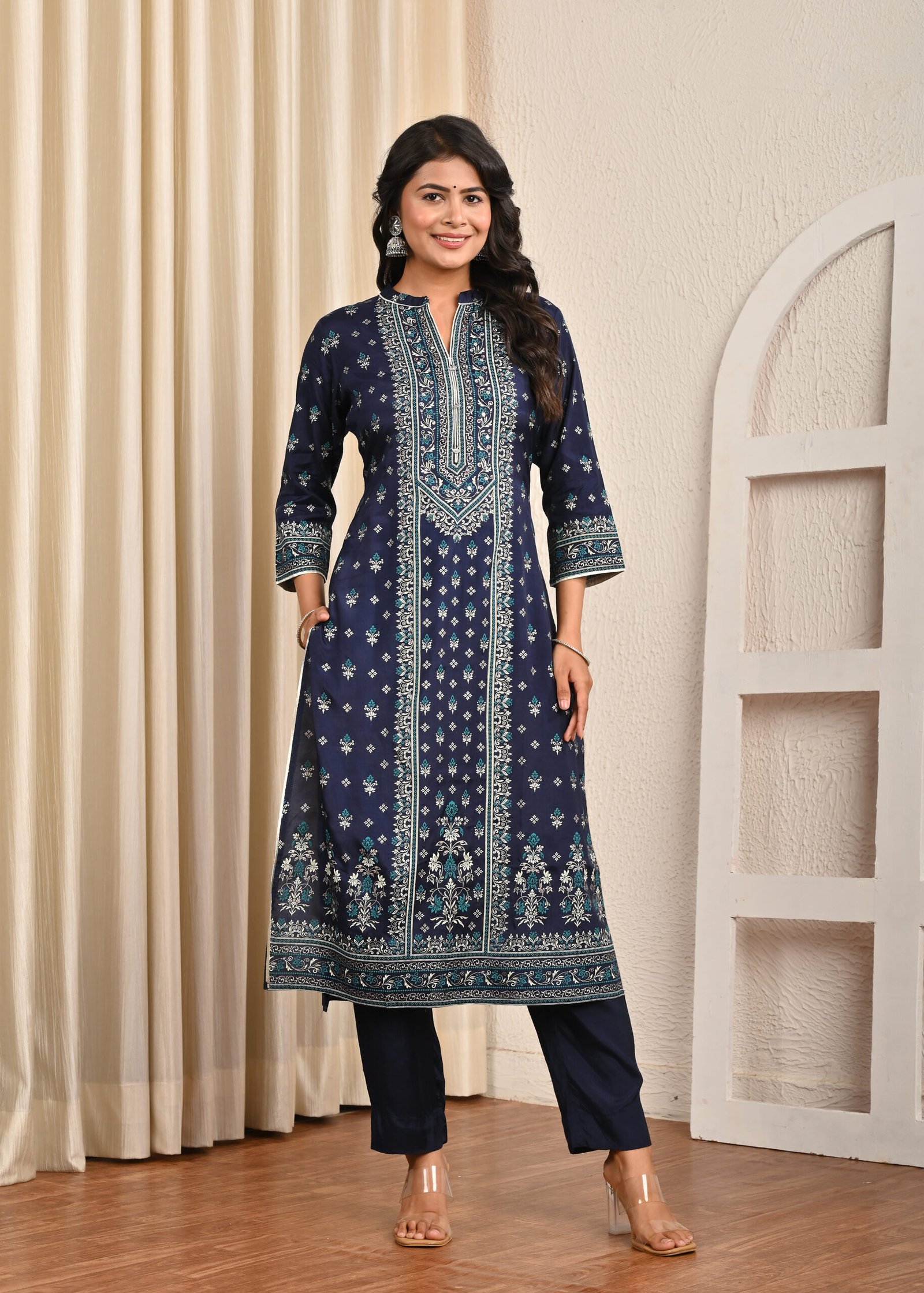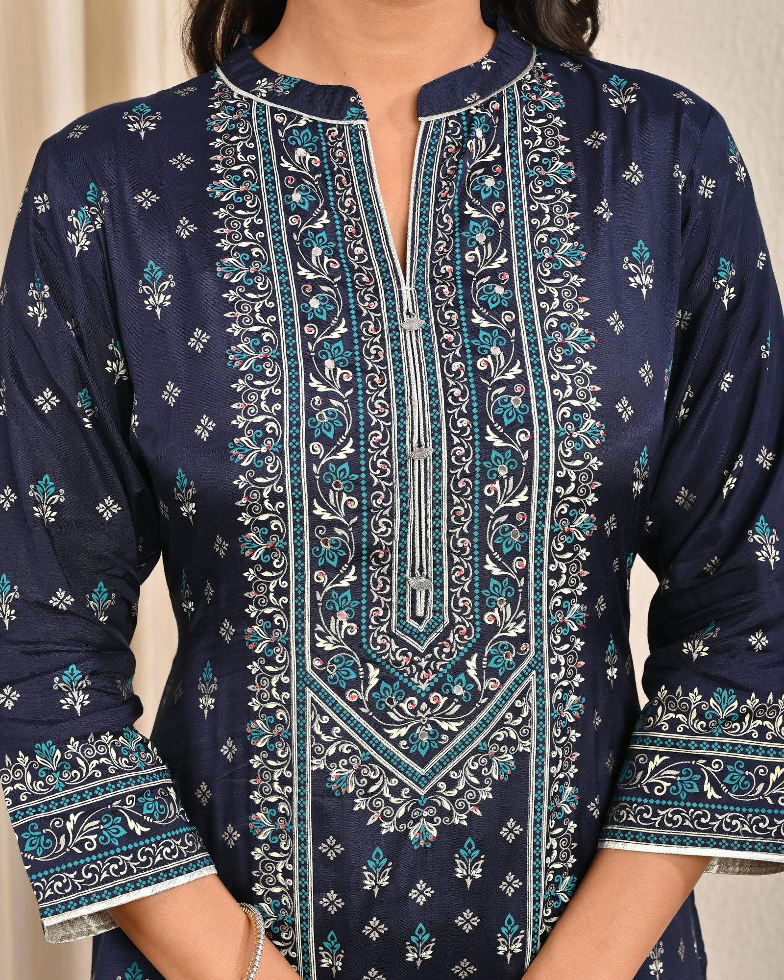 Kurta: Straight-cut, knee-length with intricate all-over traditional floral and geometric print, highlighted neckline with contrast detailing, and three-quarter sleeves.